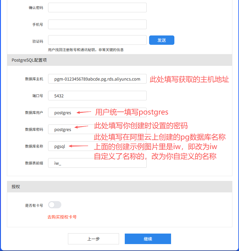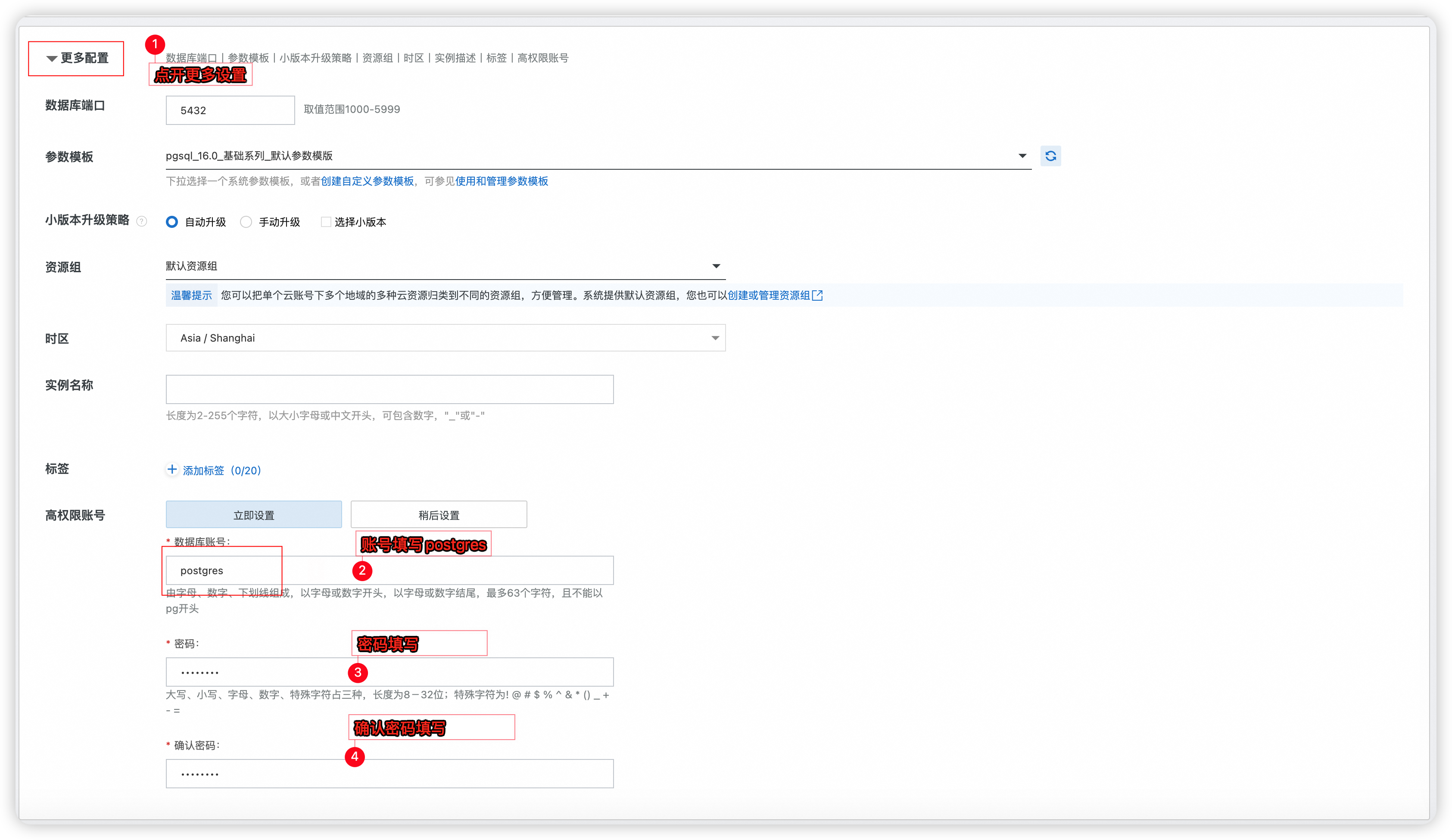 - 数据库账号一定要设置成(postgres),不然一键更新会出错 密码请不要使用postgres,容易被攻击,修改成强密码