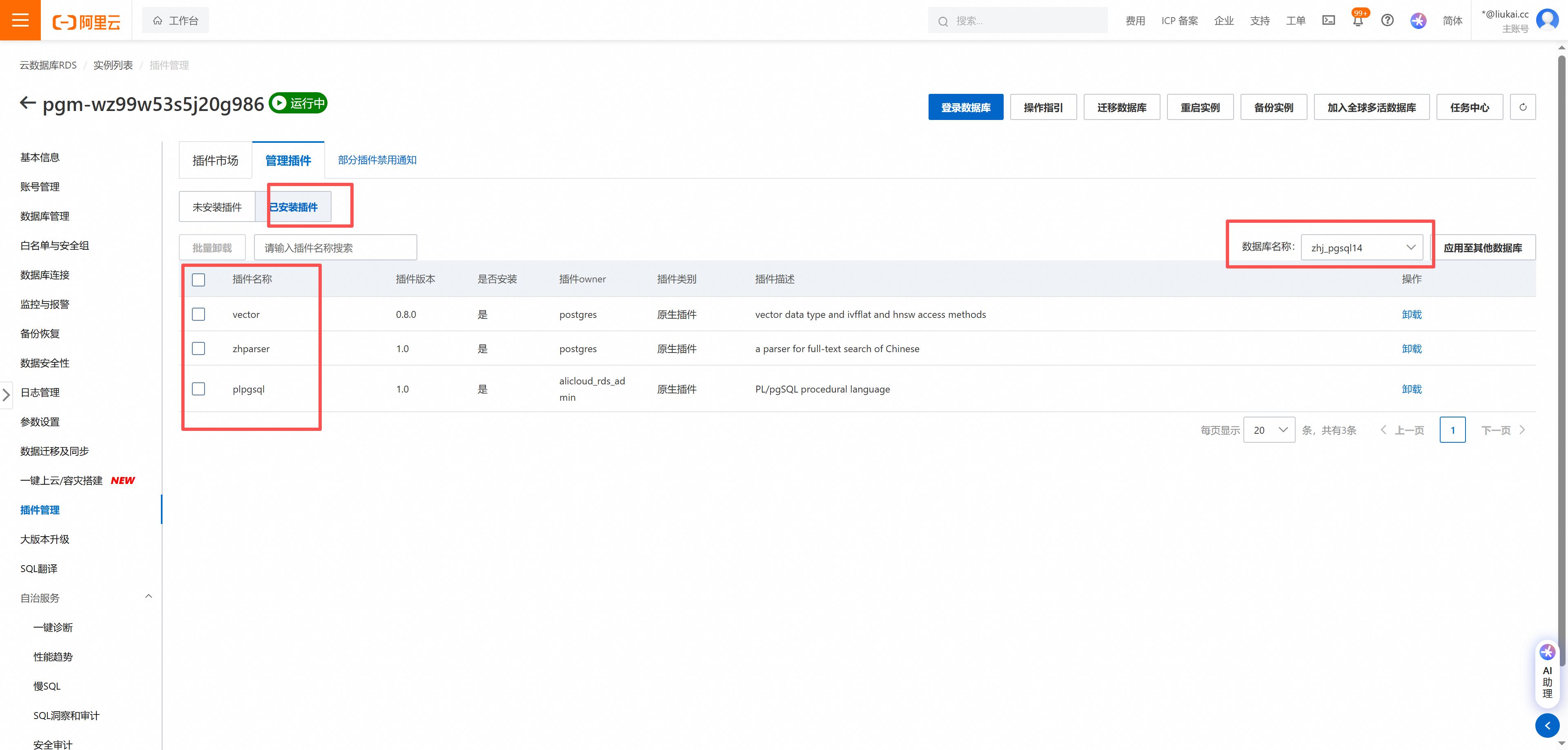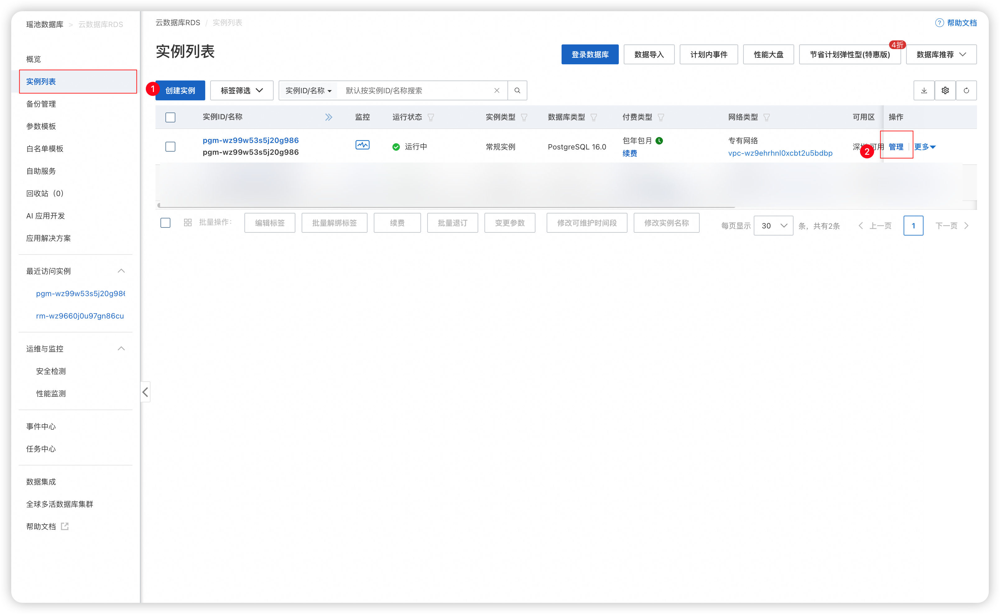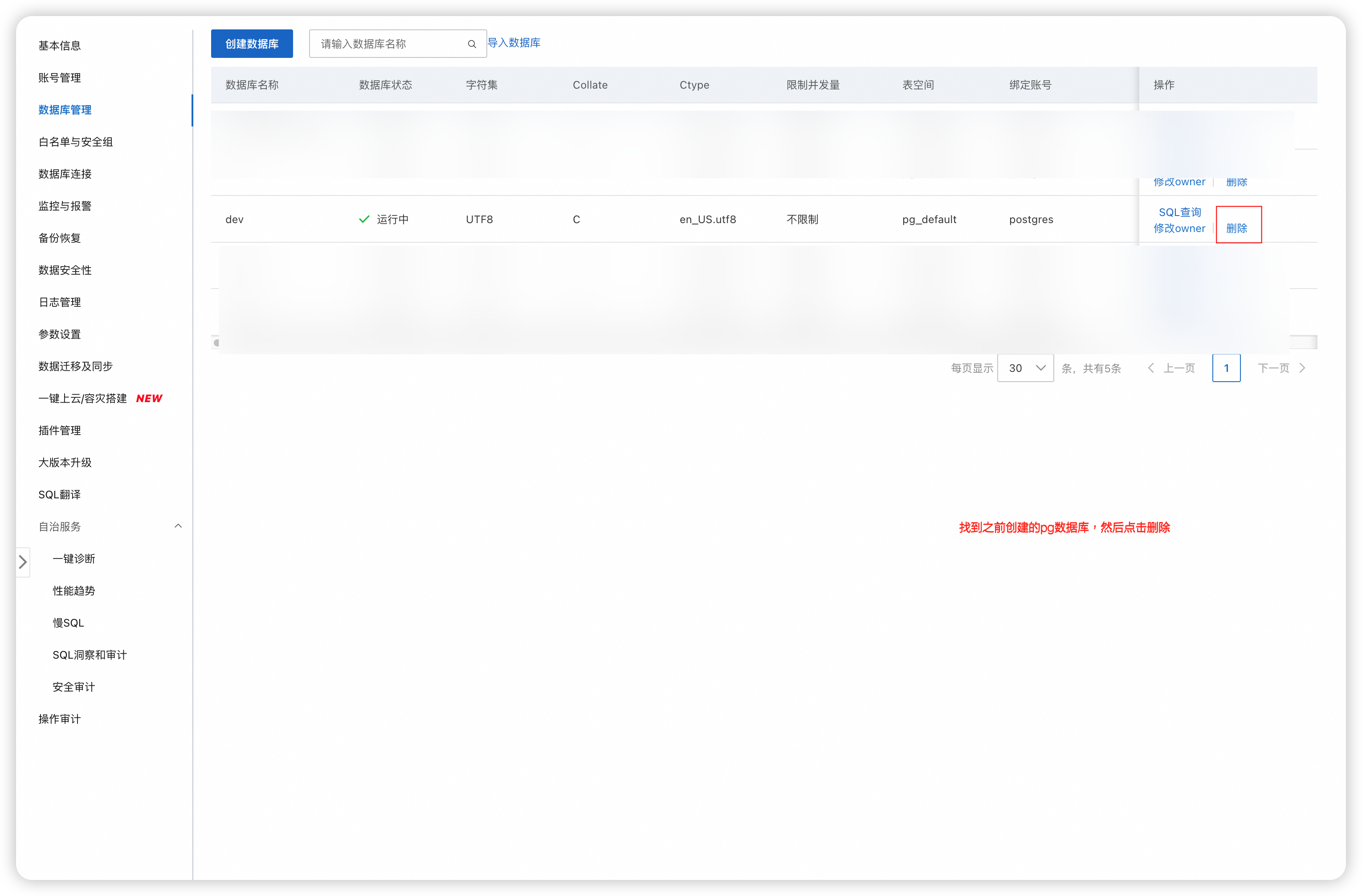 - 前往云数据库RDS找到之前创建的pg数据库,点击删除