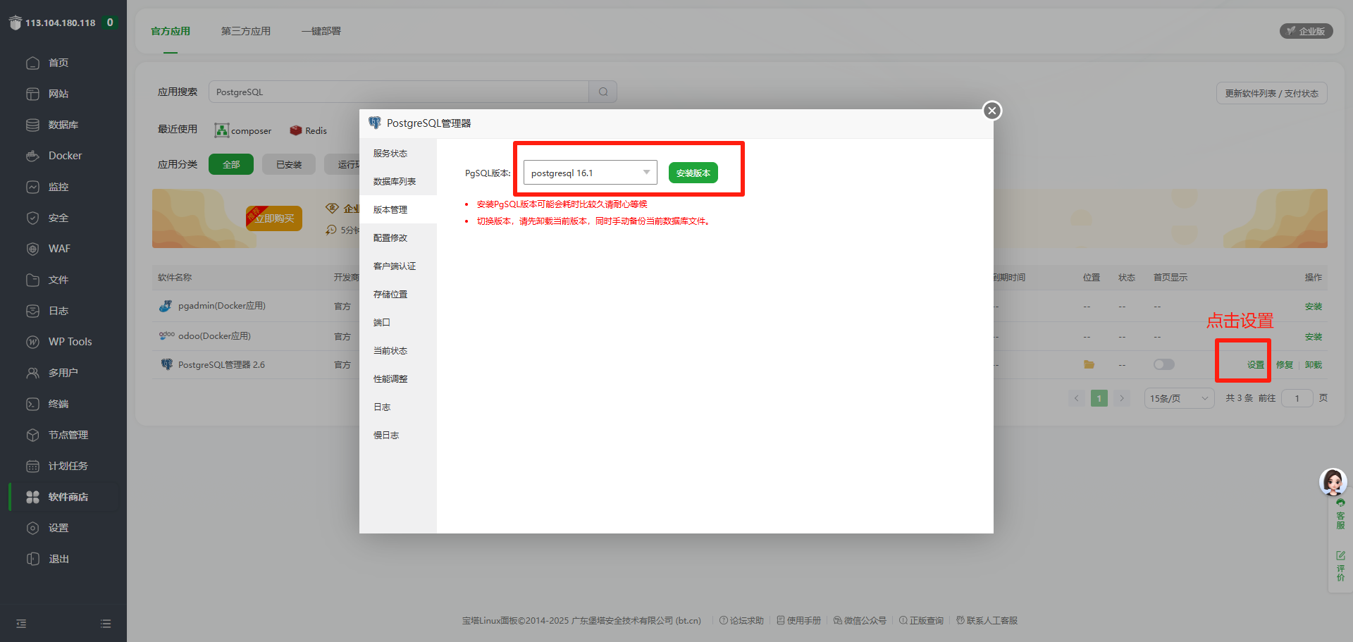 宝塔中软件商店搜索 PostgreSQL,点击安装PostgreSQL管理器