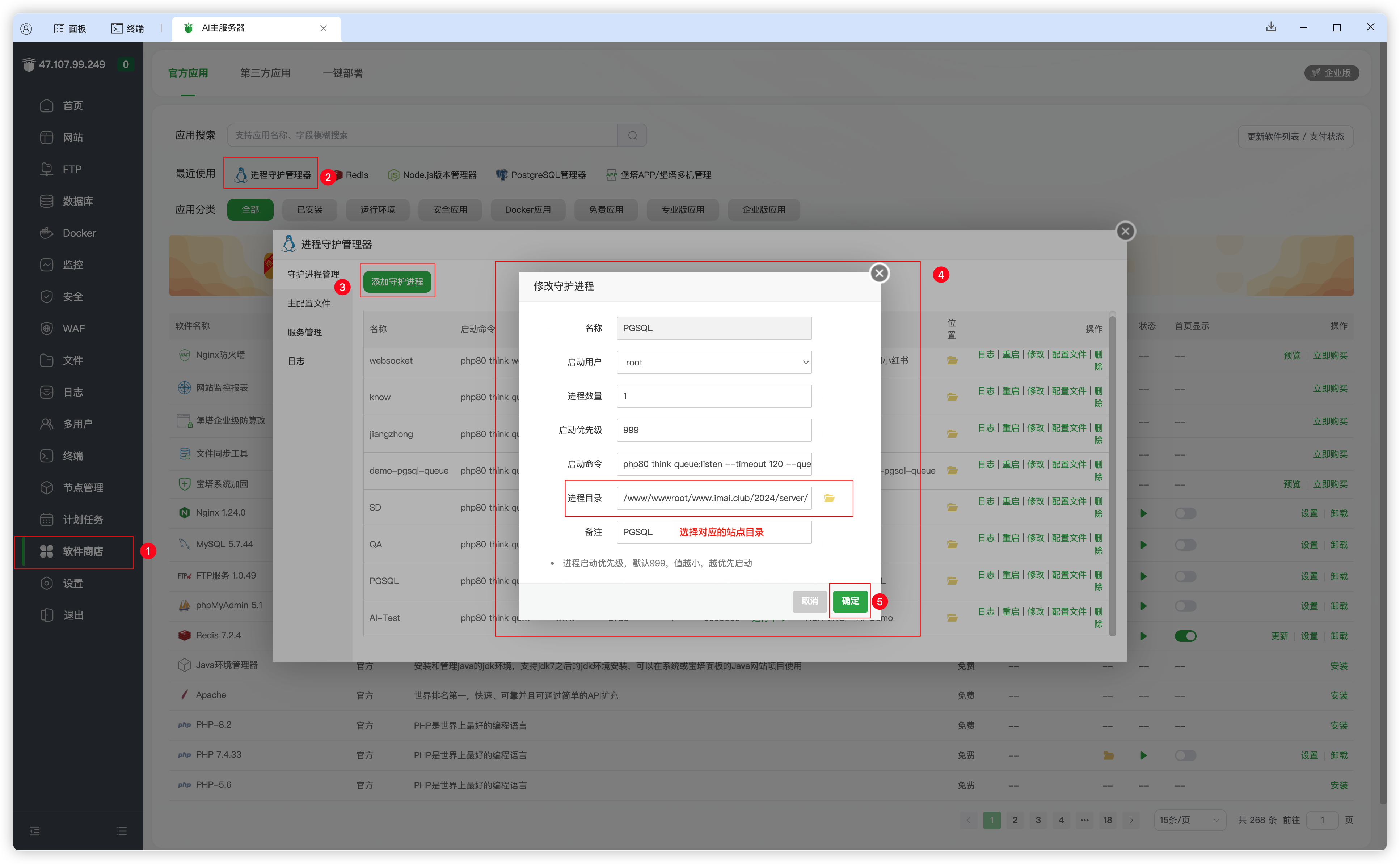 此时可以去系统后台中点击一键更新,初次安装系统是点击继续,更新或安装完成后,回到宝塔中软件商店,已安装,找到supervisor,创建守护进程,如下图,目录填写你的项目安装目录,命令如下