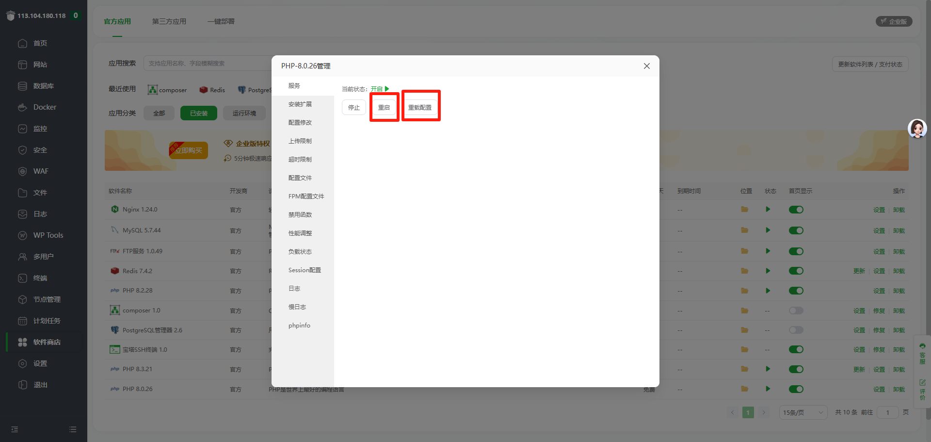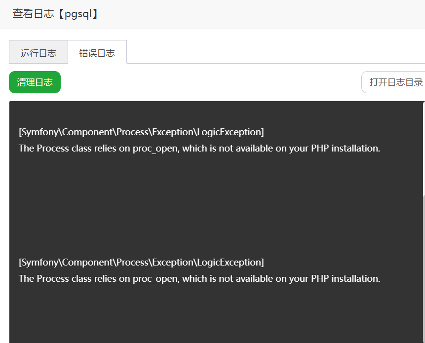 - 如果提示这个,请前往【php80】找到禁用函数,然后搜索相关的名称进行移除例如图中提示proc_open,禁用函数就删除,同理,如果提示其他,禁用函数就删除对应名称