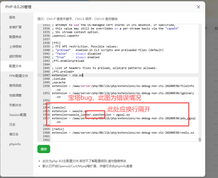 注意,宝塔面板有bug,点开配置文件,拉到最底下,查看配置信息是否有误,若正确则无需修改,若错误则需要修改调整: