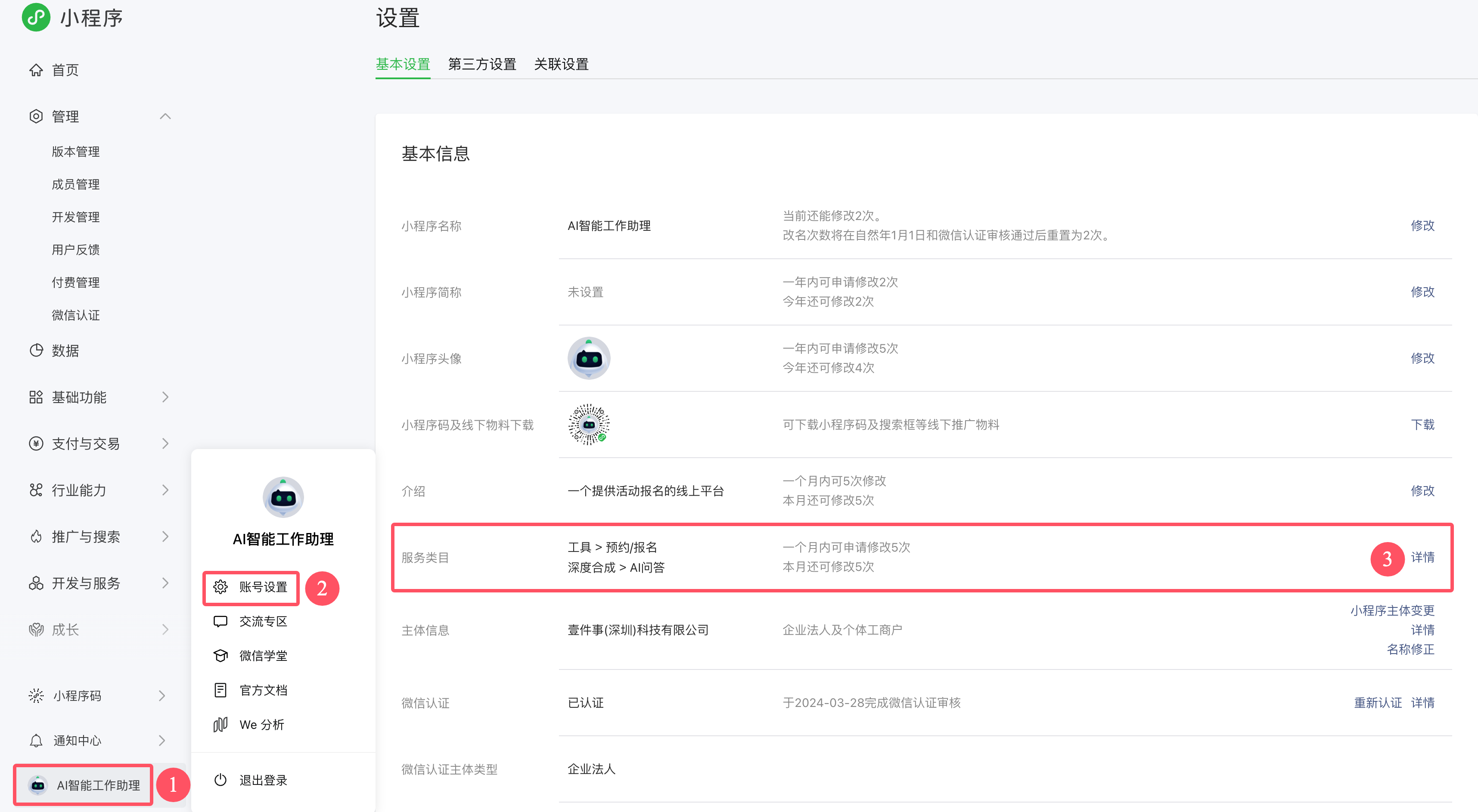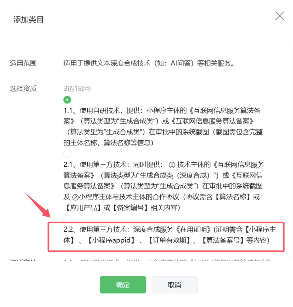 务必在小程序上添加这两个类目 【深度合成-AI问答】 【深度合成-AI绘画】 (此类目需要算法备案,备案方法参考第5步) |