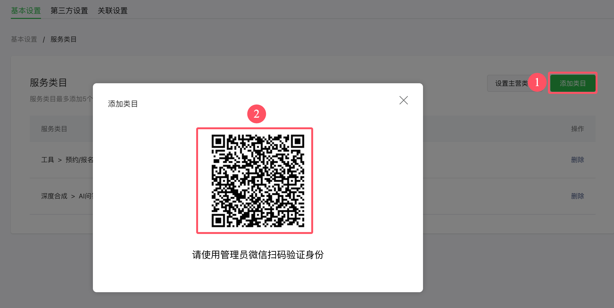 点击【添加类目】,会弹出二维码,联系管理员扫码验证