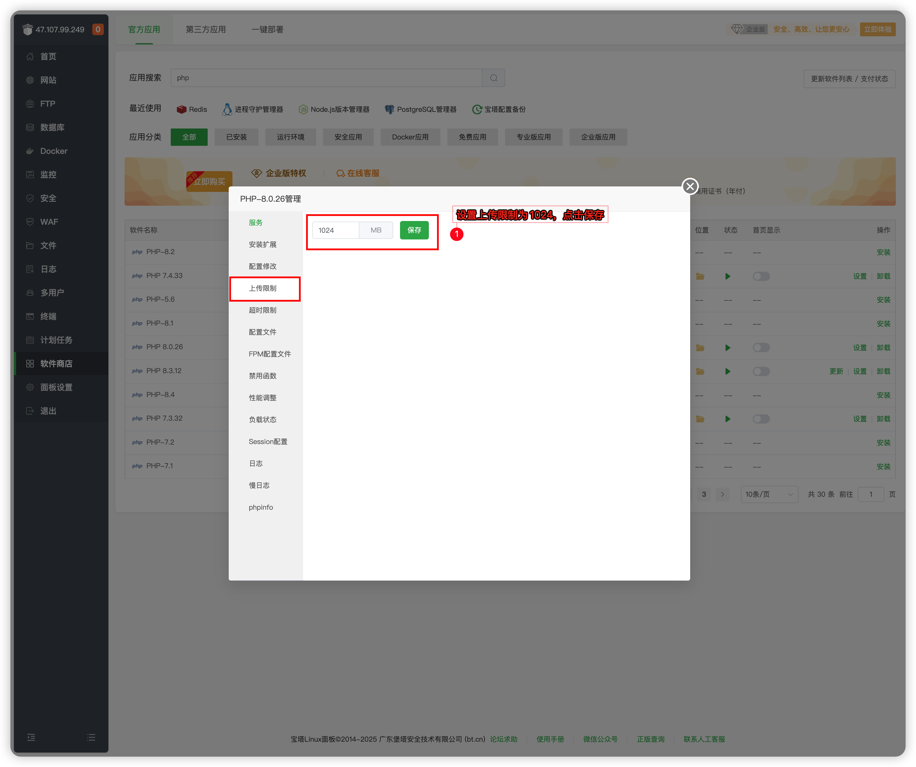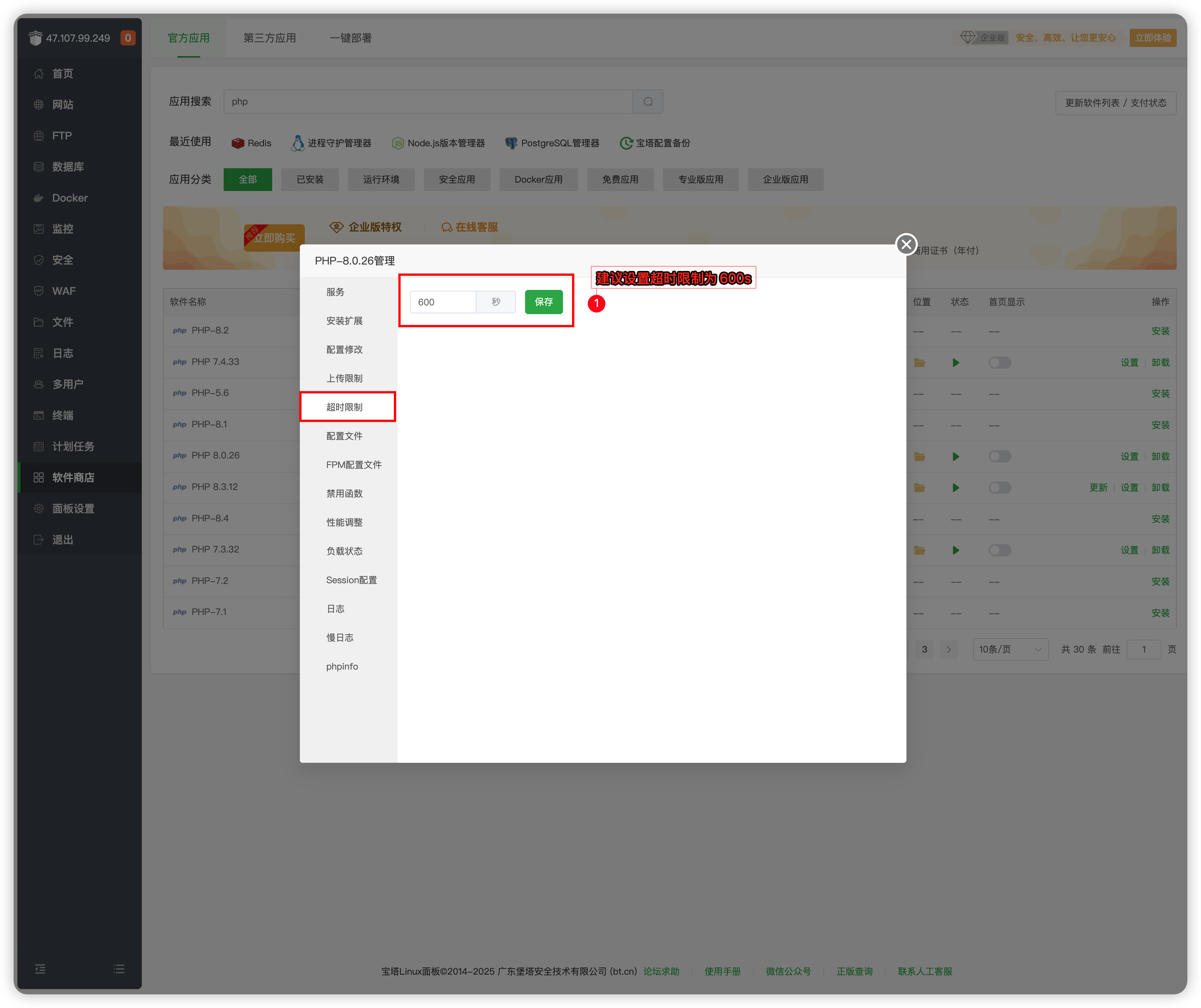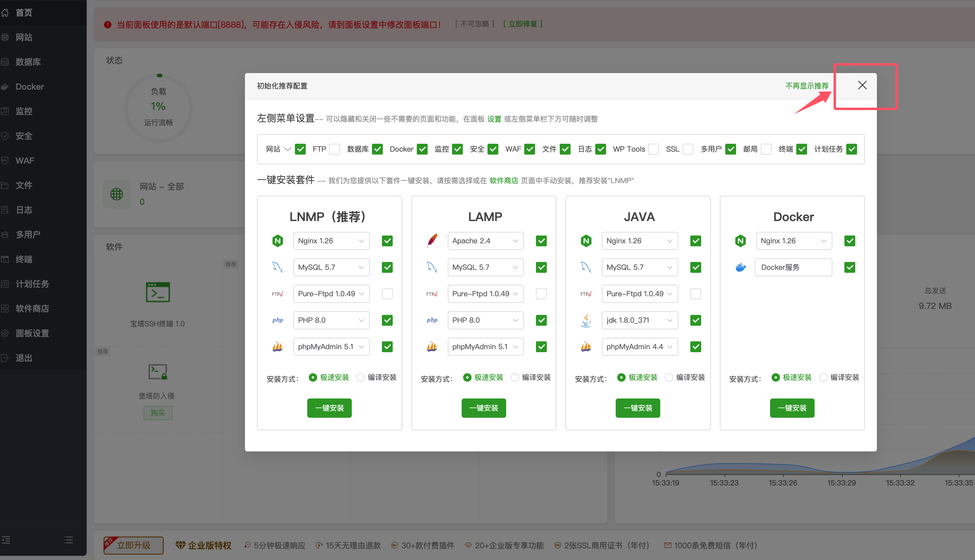 登录宝塔自动弹窗【初始化推荐配置】点击右上角X掉