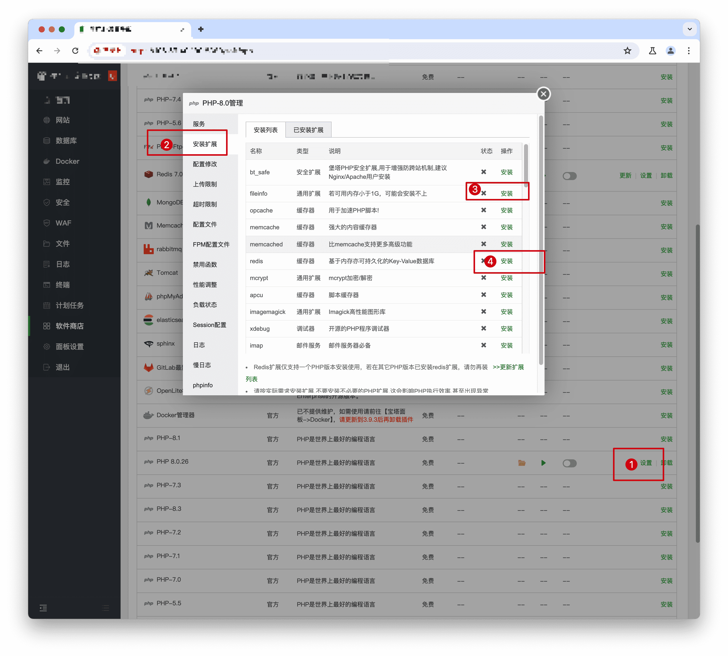 - 安装PHP扩展 找到PHP-8.0,然后点击【设置】->【安装扩展】,【安装】fileinfo扩展,【安装】redis扩展、【安装】swoole5扩展