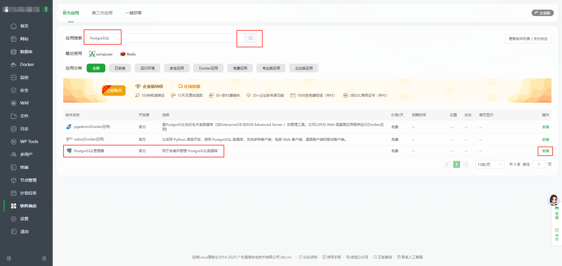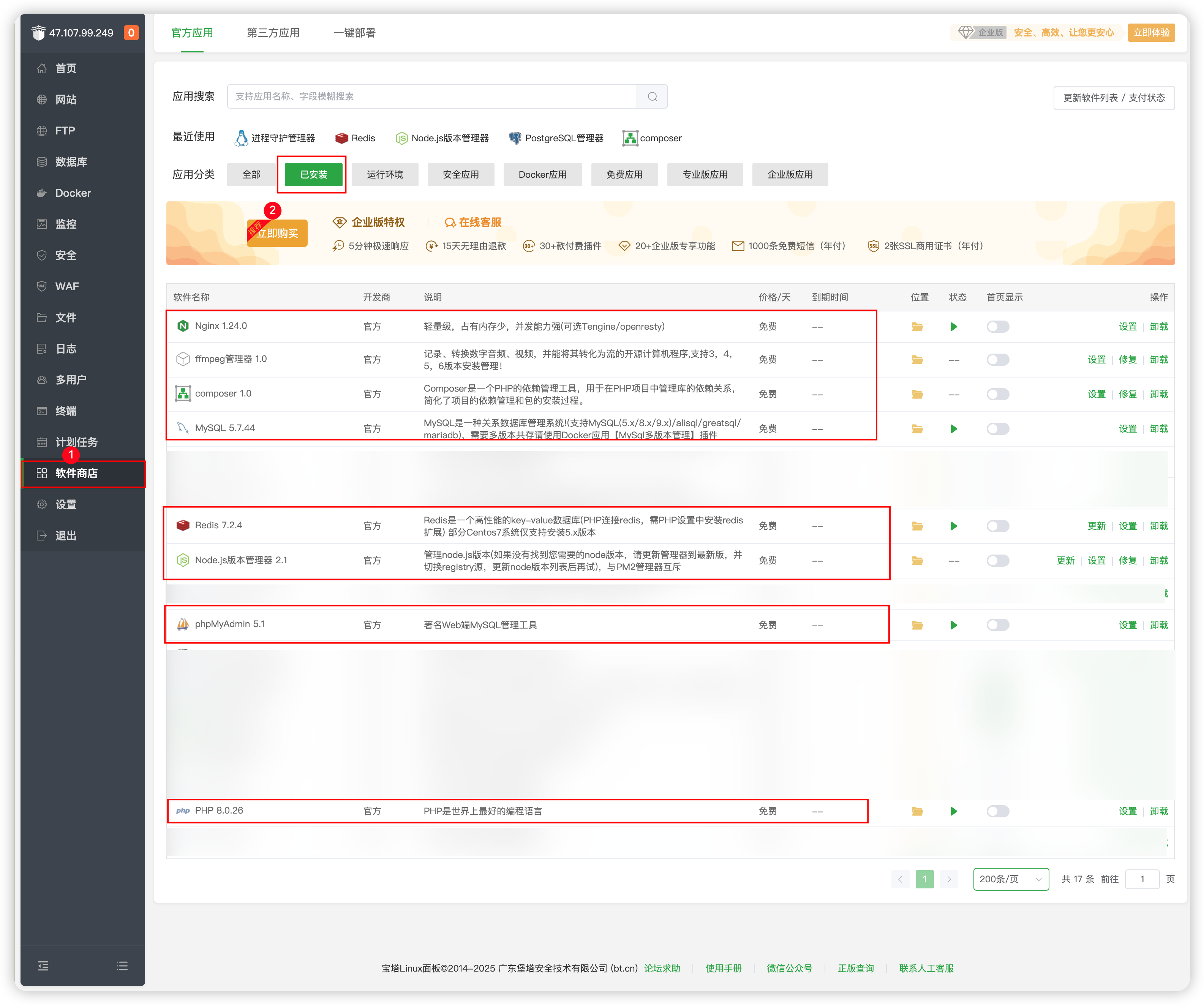 - 安装运行环境需要软件 点击【软件商店】->【运行环境】,安装Nginx、MySQL5.7、PHP-8.0(用编译下载)、Redis、Composer 、Node.js、PostgreSQL管理器