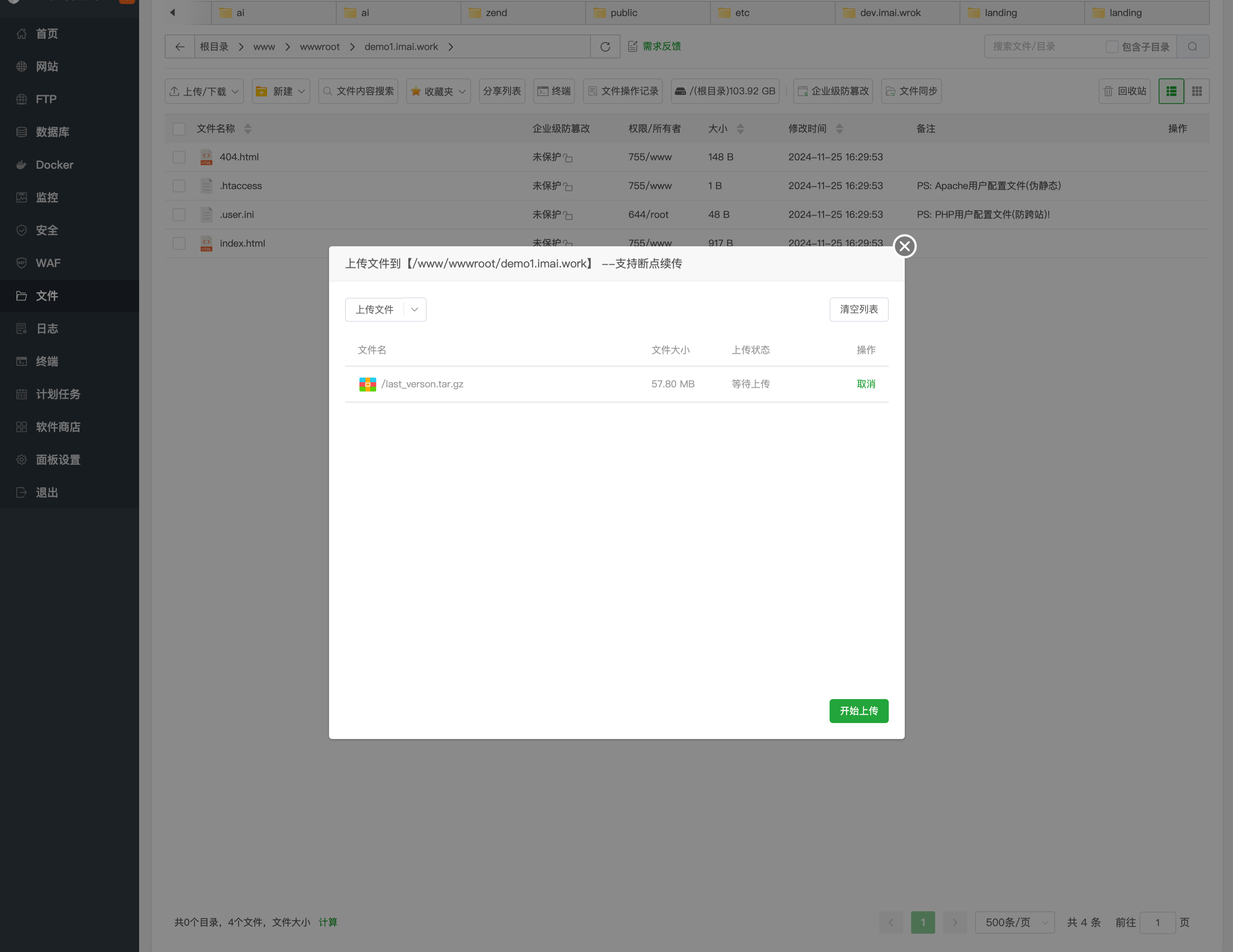 - 点击【文件】,找到添加站点时创建的文件夹,点击【上传】->【上传文件】,上传源码包,点击【开始上传】。然后右键点击压缩包解压。