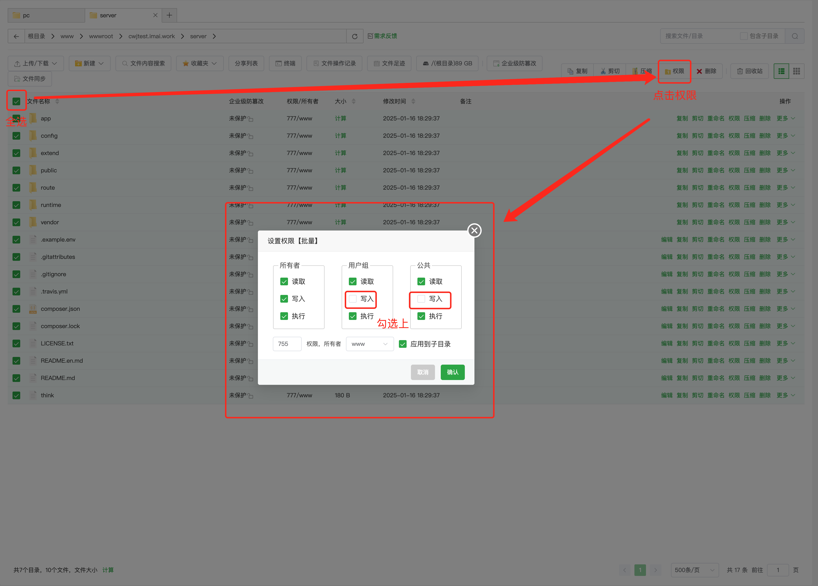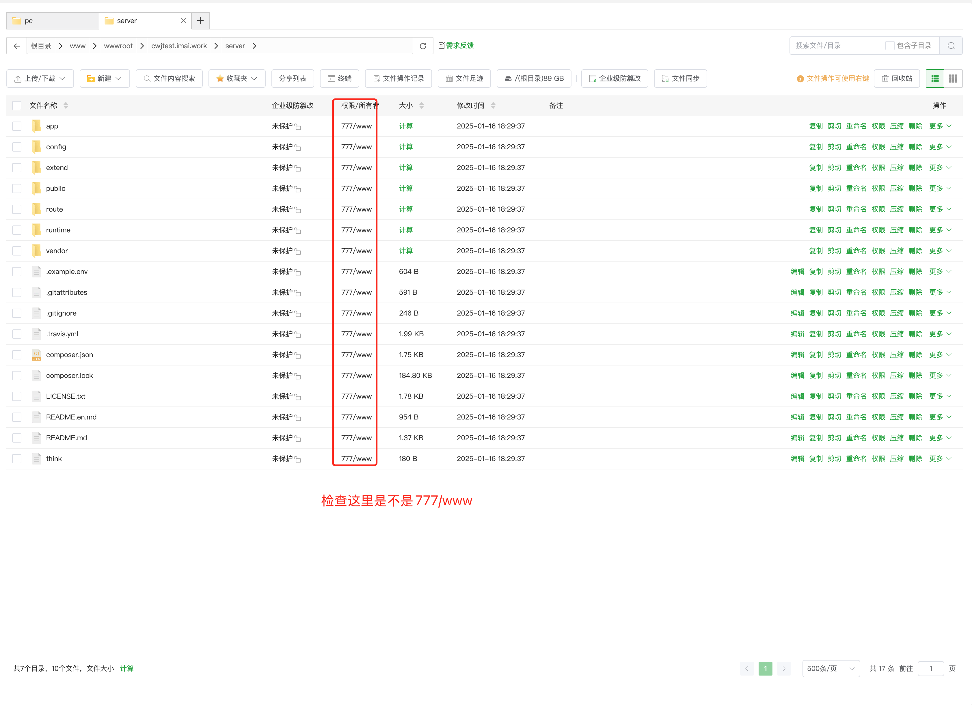 - 在server目录检查目录权限是不是【777/www】,如果是则跳过目录授权,反之需要设置目录权限为【777】