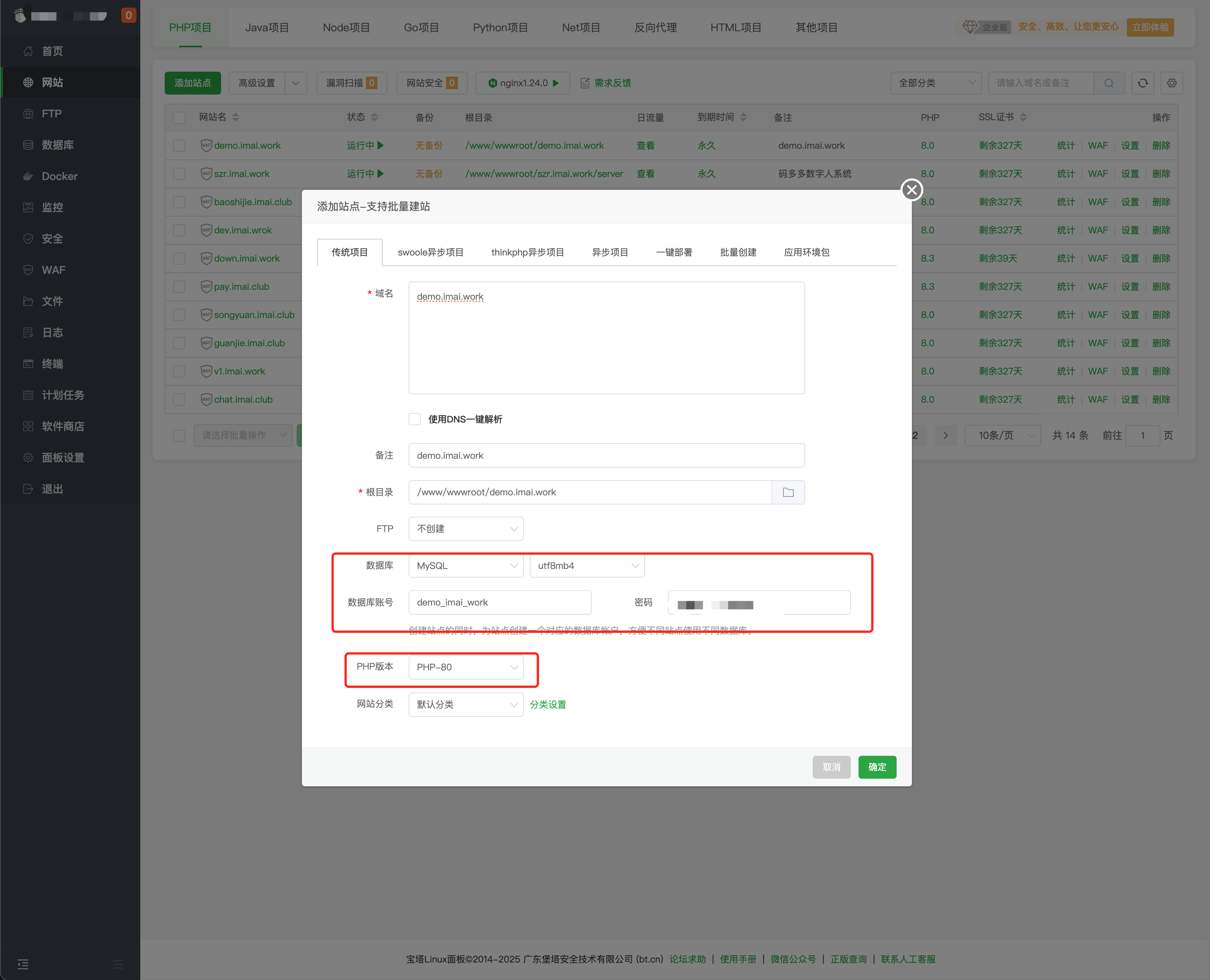 - 添加站点 点击【网站】->【PHP项目】->【添加站点】,输入域名,填写目录、数据库等信息,点击【确定】. 然后记住数据库名、用户、密码等信息,也可以在菜单【数据库】查看,这些信息安装的时候需要用到。