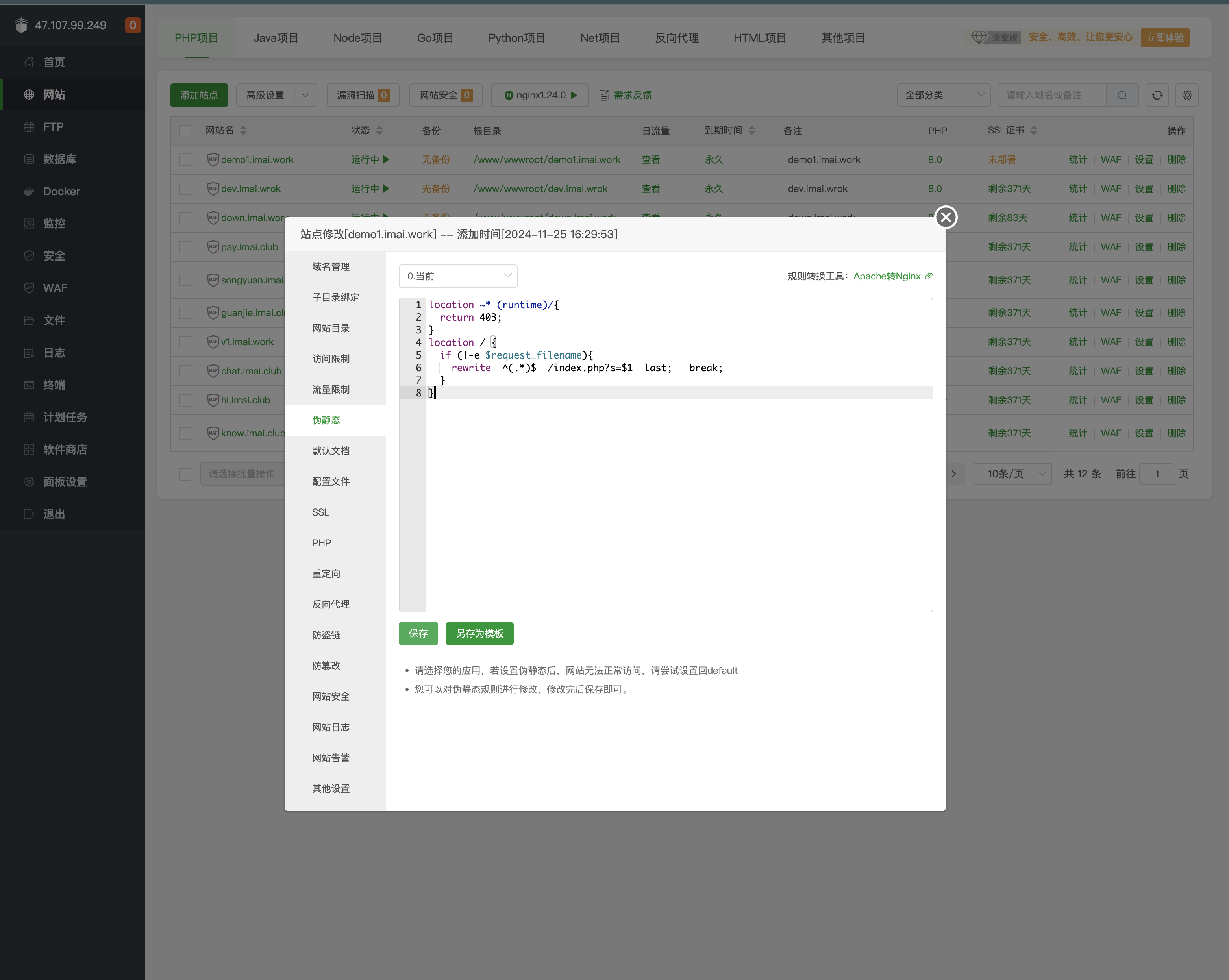- 点击【伪静态】,选择【thinkphp】,点击【保存】。设置好项目的伪静态。